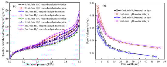 Furthermore, the pore characteristics of the reacted catalyst at different flow rates were analyzed, as shown in Figure 9 and Table 6. Compared with fresh catalysts, the ring degree of the hysteresis loop from the N2 adsorption/desorption curve of the reacted catalyst varied obviously at different flow rates of H2O steam. The pore size varied greatly in the range of 0–5 nm. In addition, H2O steam enlarged the specific surface area and pore volume of the catalyst in varying degrees. In particular, the pore characteristic of the reacted catalyst under 1 mL/min H2O steam was better, which was consistent with the analysis of the experimental results.