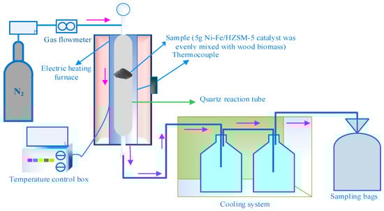 Catalytic pyrolysis of wood biomass was carried out in a vertical quartz tubular reactor to further analyze the pyrolysis behavior and product evolution, and the reaction system is shown in Figure 11, which mainly includes pyrolysis reaction device, gas collection device, condensation and collection device of tar. Ni-Fe/HZSM-5 was used as catalyst with 5 g. Before the start of the experiment, 5 g Ni-Fe/HZSM-5 catalyst was evenly mixed with wood biomass samples and placed in the reaction tube. The gas–liquid separator was connected with the reactor at the bottom through ground glass by two levels of condensation with the ice water bath. Before the start of each experiment, 5 g samples were placed in the mid-reactor and heated to a set temperature at a heating rate of 10 °C/min and kept going for a while. N2 was placed into the reactor at a flow rate of 90 mL/min for an inert environment and swept the high-temperature pyrolysis gas out. Pyrolysis gas was collected every 50 °C into sampling bags through the cooling system from 200 °C. Before sampling, the gas sampling bag shall be vacuumed and purified many times.