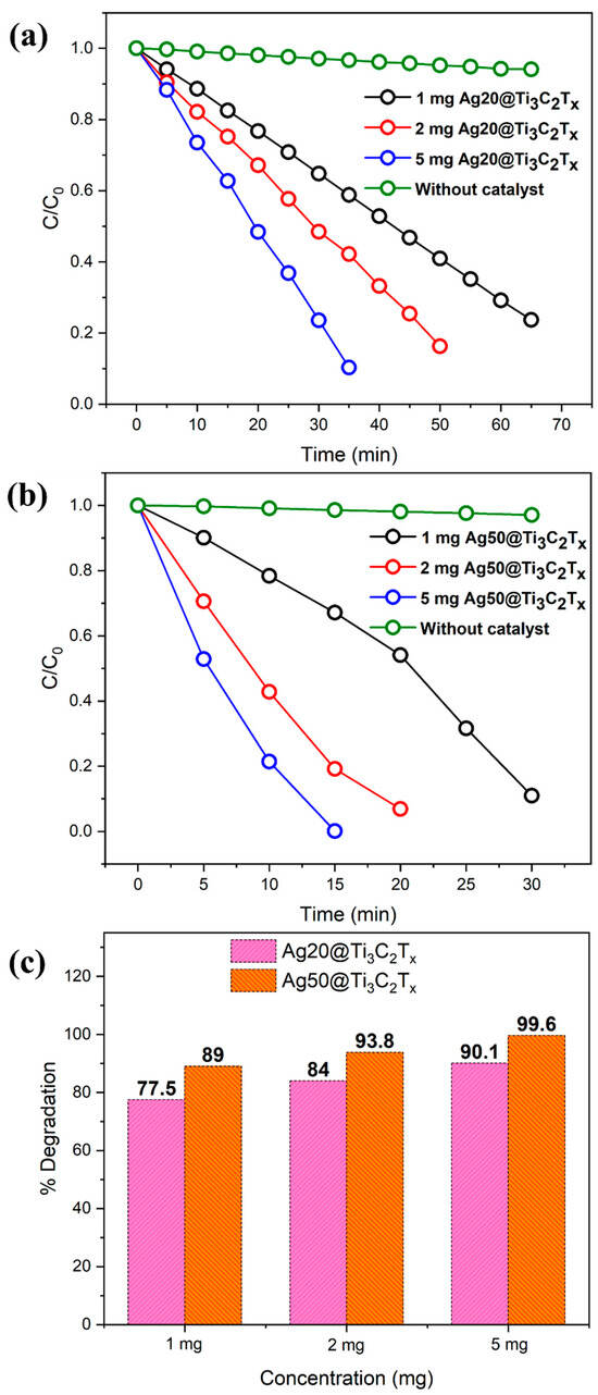 | Ag20@Ti3C2Tx Ag50@Ti3C2Tx | 5 mg | 15 min, 99.6% 35 min, 90.1% | Sunlight | This study |