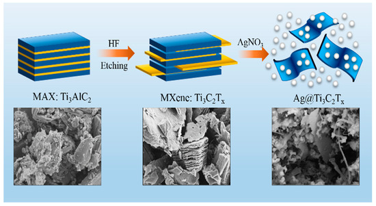 - Lv, Y.; Wang, K.; Li, D.; Li, P.; Chen, X.; Han, W. Rare Ag nanoparticles loading induced surface-enhanced pollutant adsorption and photocatalytic degradation on Ti3C2Tx MXene-based nanosheets. Chem. Phys. 2022, 560, 111591. [Google Scholar] [CrossRef]