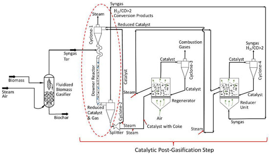 Tar post-biomass gasification process includes: (a) a fluidized bed biomass gasifier operated at 650 °C, (b) a downer unit providing tar conversion and syngas enrichment operated at 550 °C, (c) a catalyst regenerator and a catalyst reduction unit both operated at 615 °C, processing 1/10 of the catalyst downer flow.