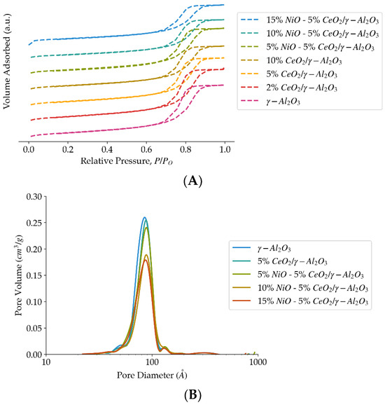(A) Adsorption-desorption isotherms obtained from N2-physysoption analysis, for different ceria and NiO loadings on the γ-Al2O3 support. (B) Adsorption-desorption isotherms obtained from N2-physysoption analysis, for different ceria and NiO loadings on the γ-Al2O3 support.