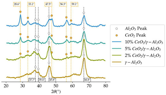 XRD patterns in the 2θ degrees diffractogram, for the different loadings of CeO2 on γ-Al2O3.