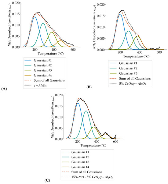 Deconvolution of NH3–TPD curves showing the four acid site types (weak, medium, strong, very strong) for: (A) γ-Al2O3, (B) 5% CeO2/γ-Al2O3, and (C) 15% NiO-5% CeO2/γ-Al2O3.