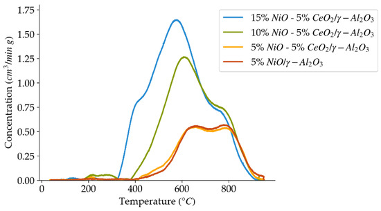 H2-TPR profiles using a 10 °C/min heating ramp, for the set of catalysts prepared with different nickel loadings.