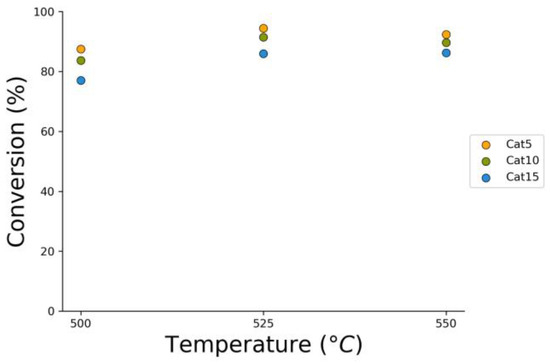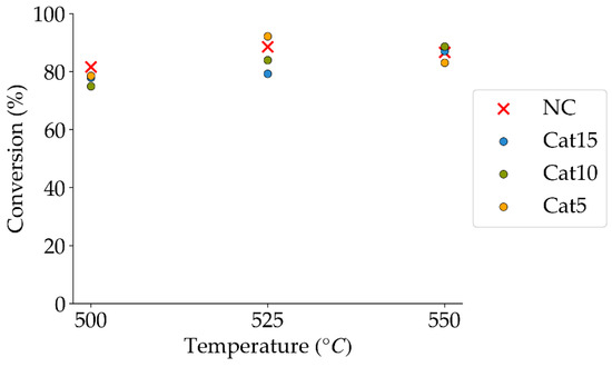 2M4MP catalytic conversions under steam (mean standard deviation: ±6%). Notes: (a) Catalysts: Cat5, Cat10, Cat15, (b) catalyst weight: 0.30 g, (c) reaction time: 10 s, (d) non-catalytic (NC) runs’ conversions are reported as a reference.