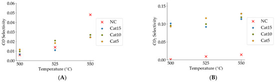 (A) Catalyst selectivity towards carbon monoxide (the mean standard deviation is ±0.007), (B) catalyst selectivity towards carbon dioxide (the mean standard deviation is ±0.01). Notes: (a) Tar surrogate: 2M4MP, (b) reaction time: 10 s, (c) steam atmosphere, (d) catalysts: Cat5, Cat10, Cat:15, (e) catalyst weight: 0.30 g, (f) non-catalytic (NC) runs’ conversions are reported as a reference.