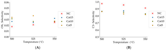 (A) Methane selectivities (mean standard deviation is ±0.004), (B) c1+ hydrocarbon selectivities (more than one carbon in their molecular formula) (the mean standard deviation is ±0.02). Notes: (a) Tar surrogate: 2M4MP, (b) reaction time: 10 s, (c) steam atmosphere, (d) catalysts: Cat5, Cat10, Cat15, (e) catalyst weight: 0.30 g, (f) non-catalytic runs’ selectivities are reported, as a reference.