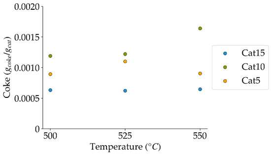 Coke formation at 10 s reaction time, under a steam atmosphere (mean standard deviation is: ±0.0003). Notes: (a) Tar surrogate: 2M4MP, (b) catalyst weight: 0.30 g, (c) catalysts: Cat5, Cat10, Cat15, (d) reported coke amounts were obtained after two consecutive injections of 2M4MP.