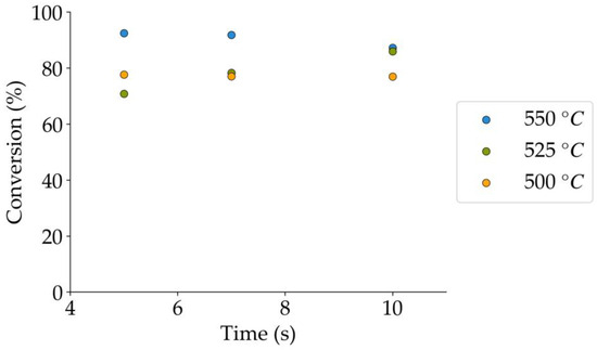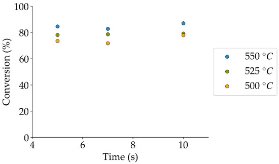 Selectivities towards C1+ hydrocarbons at the different temperatures and reaction times of the present study. Notes: (a) Tar surrogate: 2M4MP, (b) catalyst weight: 0.30 g, (c) catalyst: Cat15, (d) steam-H2/CO2 atmosphere. The mean standard deviation is ±0.09.