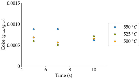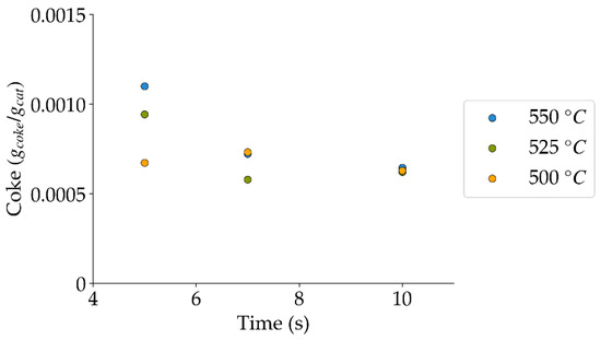 Coke formation under a steam atmosphere at the different reaction times and temperatures (mean standard deviation is: ±0.0002). Notes: (a) Tar surrogate: 2M4MP, (b) catalyst: Cat15, (c) catalyst weight: 0.30 g, (d) reported coke corresponds to that formed after two consecutive injections of 2M4MP.