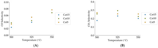 (A) CO selectivity (mean standard deviation is: ±0.01). (B) CO2 selectivity (mean standard deviation is: ±0.04). Notes: (a) Tar surrogate: 2M4MP, (b) reaction time: 10 s, (c) steam-H2/CO2 atmosphere, (d) Catalysts: Cat5, Cat10, Cat:15, (e) catalyst weight: 0.30 g.