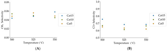 (A) Methane selectivities (mean standard deviation is: ±0.005). (B) C1+ hydrocarbon selectivities (more than one carbon in their molecular formula) (the mean standard deviation is: ±0.04). Notes: (a) Tar surrogate: 2M4MP, (b) reaction time: 10 s, (c) steam-H2/CO2 atmosphere, (d) Catalysts: Cat5, Cat10, Cat15, (e) catalyst weight: 0.30 g.