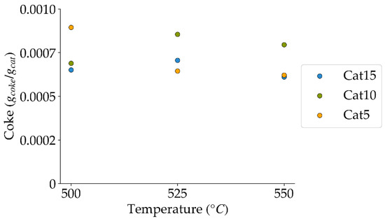 Coke formed under a steam-H2/CO2 atmosphere, at the three temperatures of the present study (mean standard deviation is: ±0.0001). Notes: (a) Tar surrogate: 2M4MP, (b) catalyst weight: 0.30 g, (c) catalysts: Cat5, Cat10, Cat15, (d) reaction time: 10 s, (e) reported coke corresponds to that formed after two consecutive injections of 2M4MP.