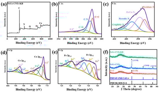 (a) XPS survey spectrum and (b) C 1s, (c) N 1s, (d) Co 2p, and (e) Fe 2p spectra of FeCo-CNTs/KB. (f) XRD patterns of Fe-C, FeCo-CNTs, and FeCo-CNTs/KB.