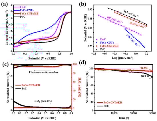 (a) ORR Linear Sweep Voltammetry (LSV) curves and (b) Tafel plots of Fe-C, FeCo-CNTs, FeCo-CNTs/KB, and Pt/C at a rotation rate of 1600 rpm with a scan rate of 10 mV s−1 in an O2-saturated 0.1 M KOH solution. (c) Electron transfer number and H2O2 yield curves and (d) current–retention time (i–t) curves at 0.715 V (vs. RHE) for FeCo-CNTs/KB and Pt/C catalysts.