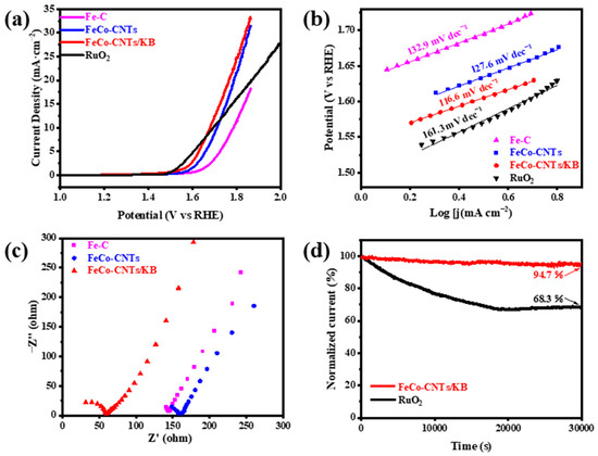 (a) OER catalytic performances and (b) Tafel plots of Fe-C, FeCo-CNTs, FeCo-CNTs/KB, and RuO2 in O2-saturated 0.1 M KOH solution with a sweeping rate of 10 mV s−1. (c) Nyquist plots of Fe-C, FeCo-CNTs, and FeCo-CNTs/KB (the inset is the equivalent circuit diagram). (d) Current–retention time (i–t) curves of FeCo-CNTs/KB and RuO2 catalysts at 1.6 V (vs. RHE) for 30,000 s.