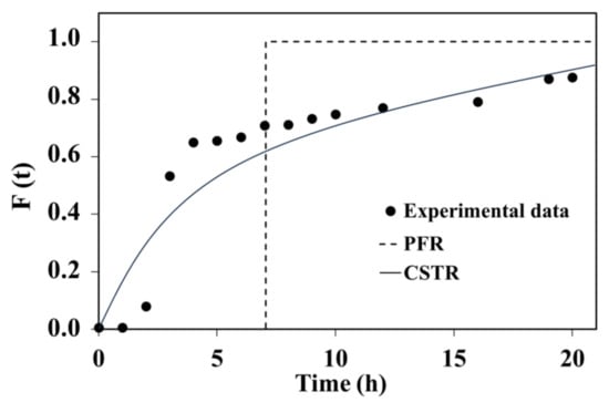 A conservative tracer experiment has been conducted using sodium bromide in the feeding solution, which was fed at a 5.8 L/d flow rate from the top of the column to port D (cathodic outlet), applying a fixed current of 100 mA, to characterise the fluid dynamic behaviour of the liquid phase and calculating the effective porosity of the packing bed. The F test curve reported in Figure 1 allowed us to determine the effective hydraulic residence time (τ) that resulted in 6.97 h, giving an effective volume of 1.7 L. A porosity of 0.47 was calculated by using the geometric volume of 3.65 L of the reactor hosting the cathodic compartment (i.e., from the top of the column to port D of the reactor). This value was consistent with previous analysis of graphite granules used as reactor filling. Moreover, the shape of the F curve depends on dispersion and the boundary conditions for the vessel. The resulting S-shaped response curves are not symmetrical (Figure 1); this indicates a large deviation from the plug flow (PF) model.