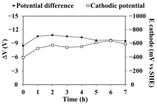 After a month of continuous flow operation, the pilot scale PBR-like column reactor had not achieved the steady-state condition yet. The potential difference between the cathode and the anode was rather steady after a few days of polarization, with an average value of −11.1 ± 0.3 V. Moreover, the overall potential difference in the system was quite higher than the actual difference between the two electrodes and most of the potential drop was concentrated across the non-conductive slice.
