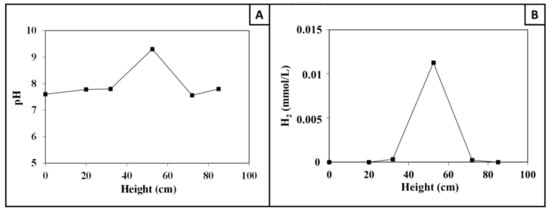 During each daily galvanostatic polarisation, the potential difference remained constant around the value of 10 V, while the value of the cathode decreased over time due to the gradual polarisation (Figure 2). After several daily cycles, the cathodic potential became more negative (−640 ± 11 mV vs. SHE). After 30 days of galvanostatic cycles, the cathode potential resulted enough negative, and it became a good environment for reductive dechlorination; on the other hand, the cell voltage between the anode and cathode decreased until −13 V, while the potential of the anode compartment became more oxidising (930 mV vs. SHE). To better understand the production of hydrogen in the system, during the daily 8 h galvanostatic test, H2 concentration and pH in the three zones (i.e., cathodic, non-conductive and anodic), the potential difference and the anodic potential were observed. As an example, Figure 3 shows a typical trend of H2 concentration, which also confirms a high concentration of H2 in the non-conductive zone and a very low level in the cathodic compartment. It shows that the H2 production took place close to the non-conductive area, and the produced H2 raised upstream in the cathodic area (Figure 3B), while it was not detected in the anode. This result is also confirmed by the value of pH (Figure 3A) since the production of H2 involves an increase in pH after the cathodic reaction: (4H2O + 4e− → 2H2 + 4OH−). The pH value was constant near the neutrality during the test both in the cathode and the anode, while it became 9 in the non-conductive area (Figure 3A). A pH increase affected water electrolysis for H2 formation []. Furthermore, the anodic reaction of oxygen led to the hydroxyl ion consumption (4OH− → O2 + 2 H2O + 4e−).