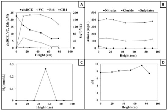 Besides instantaneous profiles along the columns, we chose to monitor the system performance over time by using three points only, i.e., the cathode compartment through port B, the cathodic effluent (non-conductive area) through the sampling port D and the anode compartment through the sampling port F. The following graphs (Figure 5C,D) show the concentrations of cisDCE, VC, methane, nitrate and sulphate in the considered sampling ports. From Figure 5A,C, it is evident that most of the influent cisDCE was removed while crossing the cathode compartment with VC as the main product (6.8 ± 0.3 μmol/L).