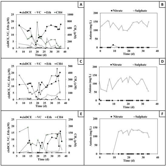 CAHs, ETH, methane (panel A,C,E) and anions (panel B,D,F) concentration in the sampling port B (cathodic electrode) (panel A,B), D (non-conductive area) (panel C,D) and F (anode electrode) (panel E,F) in the PBR reactor.
