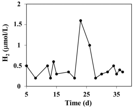During the first 20 working days, the reactor performance increased; in detail, the cisDCE was removed for more than 96%. After approximately 20 days of operation, RD, methane production and anion reduction decreased. The lack of methanogenesis and nitrate reduction was not due to the absence of hydrogen, which was detected all the time (Figure 6), and the hydrogen concentration transient increase confirmed the partially arrested metabolisms.