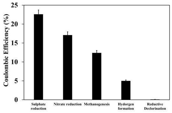The only active metabolism was the nitrate reduction, which was complete after a few working days from the reactor start-up. Additionally, the average sulphate concentration in the cathodic effluent was slightly above that of the influent, indicating that sulphate reduction was not active (Figure 5B). However, after a few working days, the RD, sulphate reduction and methanogenesis partially recovered. In particular, cisDCE had a slow reduction, but VC concentration increased from 0.9 ± 0.2 to 3.7 ± 0.4 μmol/L in sampling port D (Figure 5D). For the entire test, a high concentration of methane was detected (Figure 5A,C,D); notably, the concentration at the end of the cathodic zone was double respect to the anodic one, suggesting that methane was oxidised, and it could also be transported by the bulk flow. Time profiles at ports D (nonconductive area) and F (anode compartment) show that both RD intermediates and methane were at a lower level. However, the mechanism of this apparent removal was still unclear. In all investigated conditions, nitrate reduction was complete, and no nitrate was observed at any sampling port for the entire test duration (Figure 5B). Sulphate reduction was also observed, even though a sharp increase was observed after 25 days of operation (Figure 5D). Sulphate concentration in the effluent from the cathodic zone (port D) was almost major to the sulphate concentration leaving the anodic zone (port F); it seemed that sulphate was formed back (i.e., by anodic oxidation). However, a longer operational period would be necessary to confirm this preliminary evidence. The coulombic efficiency was calculated to determine which fraction of the current was used by the different final electron acceptors in sampling port D, that is, the cathodic effluent. Most of the current was consumed by nitrate and sulphate reduction (the latter contribution increased throughout the test), 17.1 and 22.6%, respectively. The methanogenesis contribution (12.4%) was also relevant, whereas the reductive dechlorination accounted for less than 0.1% of the transferred charge. By accounting for all the considered mechanisms (i.e., RD, nitrate reduction, sulphate reduction, methanogenesis and hydrogen formation), the overall coulombic efficiency was about 57% (Figure 7).