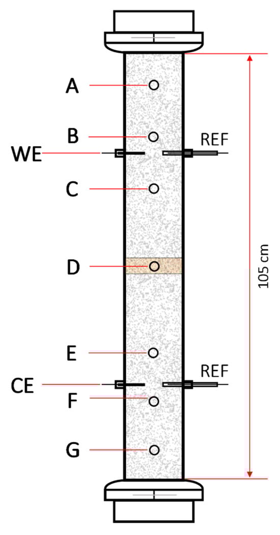 The bioelectrochemical scale-up reactor consisted of a borosilicate 1.05 m glass column with an internal diameter of 10 cm and an empty volume of 8.24 L (Figure 8). The same reactor geometry has been utilised for the realization of previous studies exploring the potential of the utilisation of the internal counter-electrode configuration []. The column was filled with conductive graphite granules with a diameter between 2 and 4 mm (Faima srl, Milano, Italy) and was held in place by two aluminium clamps to ensure air tightness. Differently from the lab scale reactor, there was no membrane, so the separation between cathodic/anodic zones was obtained by a thin layer (3 cm) of low conductivity material (silica beads). The electrical connections were ensured by placing graphite rod current collectors (with a diameter of 5 mm, Sigma-Aldrich, Milan, Italy) into each compartment. Ag/AgCl reference electrodes (+0.199 vs standard hydrogen electrode, SHE) (Amel, Milan, Italy) were placed in both chambers near the graphite rods to control the cathodic and the anodic potential. The cathode (working electrode), anode (counter electrode), and reference electrode were connected to a galvanostat-potentiostat Amel Model 551 (Milan, Italy), which was used to set the cathodic current or the cathodic potential at the desired value. The PBR reactor was equipped with seven sampling ports, each with a threaded end (diameter 20 mm), positioned along the column and designated from A to G to characterize the system’s performance. Port A served as the influent inlet, while port G served as the effluent outlet for up-flow mode operation. Sampling of the cathode was conducted through ports B and C, sampling of the low conductivity layer through port D, and sampling of the anode through ports E and F. (Figure 8).