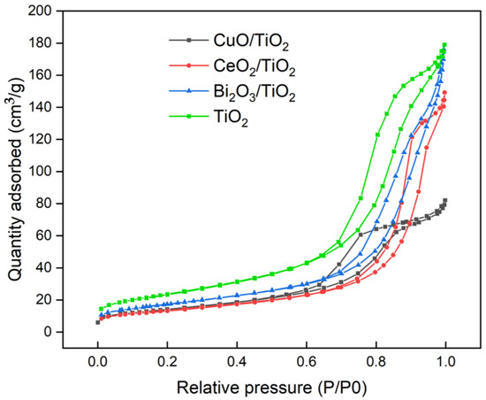 Figure 1 illustrates the nitrogen adsorption–desorption isotherms of the photocatalysts. It shows that there is no overlap between the adsorption and desorption curves of all photocatalysts presenting type IV isotherm species according to the International Union of Pure and Applied Chemistry isothermal classification. The type IV isotherm, with a capillary effect resulting in the hysteresis loop, is usually observed in mesoporous materials [23]. A more detailed examination of the hysteresis loop revealed that TiO2, CeO2/TiO2, and CuO/TiO2 had a type H2 loop that contributed to the complex pore structure, with the pores in the shape of ink bottles [24]. The desorption curve of CuO/TiO2 showed a steep desorption branch at a lower relative pressure region, indicating a smaller pore diameter of CuO/TiO2. Further, Bi2O3/TiO2 showed a H3-type hysteresis loop with a lower limit of the desorption branch located at the cavitation-induced P/P0. This phenomenon showed that the average pore diameter of Bi2O3/TiO2 was larger than those of TiO2, CeO2/TiO2, and CuO/TiO2. Table 1 summarizes the specific surface areas (SSAs) and average pore diameters of the photocatalysts. The SSAs of the photocatalysts were in the order TiO2 > Bi2O3/TiO2 > CeO2/TiO2 > CuO/TiO2, while the average pore diameters were in the order Bi2O3/TiO2 > CeO2/TiO2 > TiO2 > CuO/TiO2. Because Bi2O3/TiO2 had the highest SSA among the three metal-oxide-modified photocatalysts, it could have more active sites over the surface of inner pores to adsorb the reactant (Hg0). Additionally, it had a larger pore diameter, which could more easily move the desorbed product (HgO) out of the photocatalyst through its inner pore passages. As a result, Bi2O3 had better photocatalytic oxidation efficiency for Hg0 compared to the other two photocatalysts.