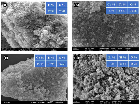 FE-SEM images and EDS results (atomic %) of (a) TiO2, (b) CuO/TiO2, (c) CeO2/TiO2, and (d) Bi2O3/TiO2.