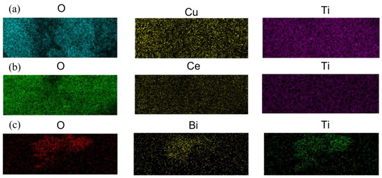 Mapping analysis of photocatalysts (a) CuO/TiO2, (b) CeO2/TiO2, and (c) Bi2O3/TiO2.