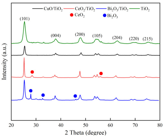 The modification of CuO and CeO2 to TiO2 was further performed using an impregnation method [46]. The molar ratios of CuO/TiO2 and CeO2/TiO2 were 5% and 7%, respectively. Initially, certain amounts of metal oxide precursors were added to the solution of self-prepared TiO2, and DI water, and magnetically stirred for 12 h at room temperature. The solution was centrifuged to remove metal ions and the precipitate was then dried at 80 °C and calcined at 450 °C for 2 h. In this study, the molar ratio of Bi2O3 and TiO2 was 3%. Bi2O3/TiO2 was synthesized using the hydrothermal method [47]. Bismuth nitrate was added to the solution of prepared TiO2 and DI water and magnetically stirred for 1 h at room temperature. The solution was then transferred to the autoclave for a hydrothermal reaction at 180 °C for 24 h and then centrifuged to remove metal ions. The precipitate was further dried at 80 °C and then calcined at 450 °C for 4 h.