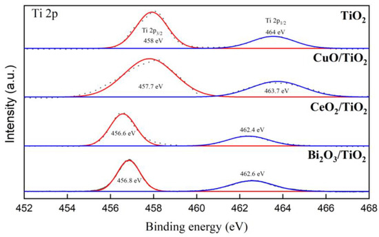 XPS spectra of Ti 2p over TiO2, CuO/TiO2, CeO2/TiO2, and Bi2O3/TiO2.