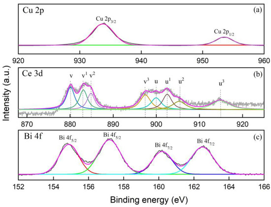 Figure 7 illustrates the XPS spectra of Ti 2p over TiO2, CuO/TiO2, CeO2/TiO2, and Bi2O3/TiO2. It shows two characteristic peaks at around 458 and 464 eV in the pristine TiO2, attributed to Ti 2p3/2 and Ti 2p1/2, respectively, also indicating that Ti appears in Ti4+. After modification with metal oxides, the electron cloud around Ti decreased and the oxidation state decreased, leading to a shift of the peaks to lower binding energy [34]. Figure 8 depicts the characteristic peaks of metal oxides in the photocatalysts. Cu had two characteristic peaks at 933.8 and 953.4 eV, labeled Cu 2p3/2 and Cu 2p1/2, respectively, with a binding energy gap of 19.6 eV, indicating that Cu was mainly in the form of Cu2+ instead of Cu1+ and Cu0 [35]. Ce 3d spectra were classified into Ce 3d3/2 and Ce 3d5/2, labeled u and v, respectively. The peaks u1 and v1 corresponded to Ce4+, while the peaks u, v, u2, v2, u3, and v3 corresponded to Ce3+ [36]. The Bi 4f spectra showed that Bi was present as Bi0, with two characteristic peaks at 154.9 and 160.2 eV, and Bi3+, which exhibited two characteristic peaks at 157.2 and 162.5 eV [37]. Different valence states provide strong oxygen storage capacity, which can capture oxygen from the atmosphere and oxidize Hg0 to Hg2+. Figure 9 presents the O 1s spectra of TiO2, CuO/TiO2, CeO2/TiO2, and Bi2O3/TiO2. Herein, Oα at a lower binding energy is assigned to lattice oxygen, while Oβ at a higher binding energy is the chemisorbed oxygen and surface hydroxyl group, which has been reported to have higher activity to conduct oxidation reactions [38,39]. The integration area showed an increased proportion of Oβ with the modification of metal oxides, further increasing Hg0 oxidation efficiency. Additionally, the increased binding energy compared with that of TiO2 indicated an increased oxidation state (O2− to O−), which could enhance the photocatalytic oxidation of Hg0 [40].