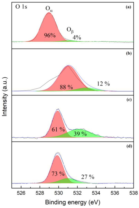 XPS spectra of O 1s over (a) TiO2, (b) CuO/TiO2, (c) CeO2/TiO2, and (d) Bi2O3/TiO2.