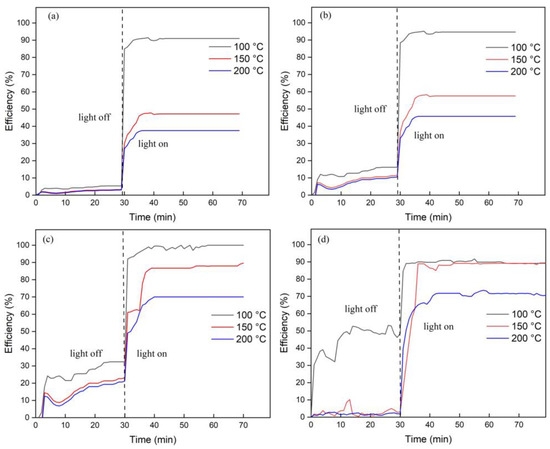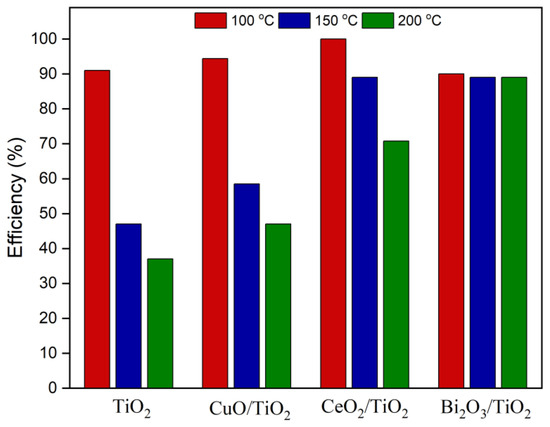 Figure 10 illustrates the photocatalytic oxidation efficiencies of Hg0 in an N2 + Hg0 atmosphere at reaction temperatures ranging from 100 to 200 °C for 2 h using TiO2, CuO/TiO2, CeO2/TiO2, and Bi2O3/TiO2. The photocatalytic oxidation efficiencies of Hg0 for TiO2, CuO/TiO2, and CeO2/TiO2 decreased with reaction temperature. However, an opposite trend was observed for Bi2O3/TiO2. The photocatalytic oxidation efficiencies of Hg0 for TiO2 was 91% at 100 °C and then dropped to 36% at 200 °C, showing a dramatic decrease of nearly 60% as reaction temperatures increased from 100 to 200 °C. However, after modifying using Bi2O3, the photocatalytic oxidation efficiency of Hg0 improved. To clarify the contribution of the photocatalytic and the traditional catalytic oxidation, we conducted continuous experiments, first without UVA to let the catalyst react as a traditional thermal catalytic reaction. The catalytic oxidation efficiency of Hg0 reached its maximum after 30 min, as shown in Figure 11. As a catalyst, TiO2 had less than 5% of the catalytic oxidation efficiency of Hg0 without the irradiation of UVA. By modifying TiO2 with metal oxides, the oxidation efficiency of Hg0 increased significantly. CuO/TiO2, CeO2/TiO2, and Bi2O3/TiO2 had the best catalytic oxidation efficiencies of Hg0 at 100 °C, which were 15%, 32%, and 52%, respectively. Secondly, we turn on UVA to allow the materials to undergo the photocatalytic reaction. The photocatalytic reaction efficiencies of Hg0 increased dramatically for metal-oxide-modified TiO2. The results showed that, for all the tested catalysts, photocatalysis contributed more than classical thermal catalysis. A previous study reported that TiO2 modified with metal oxide could yield more surface oxygen [41]. These findings concurred with the XPS analytical results obtained in this study. Equations (1)–(3) show the production of surface chemisorbed oxygen (Oβ) through the chemical reaction of metal oxides. Metal oxides can promote photocatalytic reactions, with their effectiveness in the order Bi2O3 > CeO2 > CuO. At 200 °C, CuO/TiO2, CeO2/TiO2, and Bi2O3/TiO2 had performances of 47, 71, and 89%, respectively. Furthermore, Bi2O3 exhibited excellent thermal stability, retaining almost the same oxidation efficiency at temperatures between 100 and 200 °C.