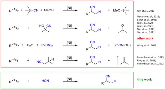Synthetic routes employing HCN surrogates are usually safer to be performed on a lab scale. However, they are of little interest for larger-scale industrial application. The formation of coupled products or byproducts severely diminishes the economic value of a process and is therefore highly undesirable. Pure hydrogen cyanide, produced via the Andrussow process or the BMA process, is readily used for large-scale hydrocyanation of butadiene [