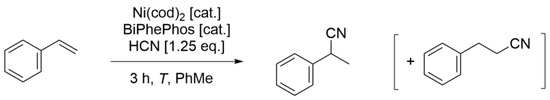 16]. Early academic studies on hydrocyanation mainly used HCN surrogates like acetone cyanohydrin, which require elevated temperatures of 60 to 90 °C to liberate HCN. For reasons of comparability, these conditions were mostly kept in successive work, even when pure HCN was used. So far, there is limited research focused on optimizing the experimental methodology.