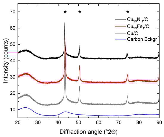 Diffractogram of copper-based catalyst materials obtained by impregnation after calcination at 500 °C. The measurements were taken in the range of 10° to 90° 2Θ with radiation. Shown from top to bottom are: Cu99Ni1/C in black, Cu99Fe1/C in red, and Cu/C in gray with activated carbon (blue) as a background. The indices represent the desired chemical composition in atomic percent. The background is not subtracted in the graphs. Cu reflexes are indexed as stars.