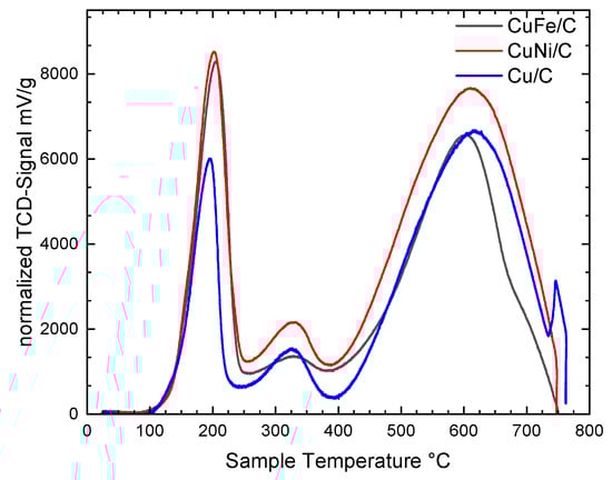 The proportion of reducible compounds in the catalyst materials Cu/C, Cu99Fe1/C, and Cu99Ni1/C after calcination was investigated using TPR measurements. Reduction curves for these copper-based catalyst materials are depicted in Figure 2.