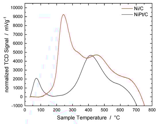 TPR measurements of the nickel catalysts Ni/C and NiPt/C produced by impregnation. The mass-normalized signal of the TCD is shown. Measurement conditions: 2%H2 in argon, = 30 mL/min, and = 10 K/min.
