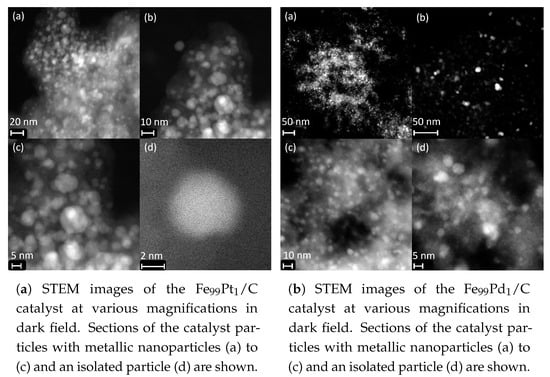 For the Fe99Pd1/C catalyst, the STEM images are shown in Figure 9b and Figure 10. Here, too, it is clear from Figure 9b that the particles are locally present on the carbon support in high concentrations, which are poorly resolved. However, it is also evident that locally isolated particles are present, which exhibit high contrast and have an approximately round geometry with consistently high contrast.