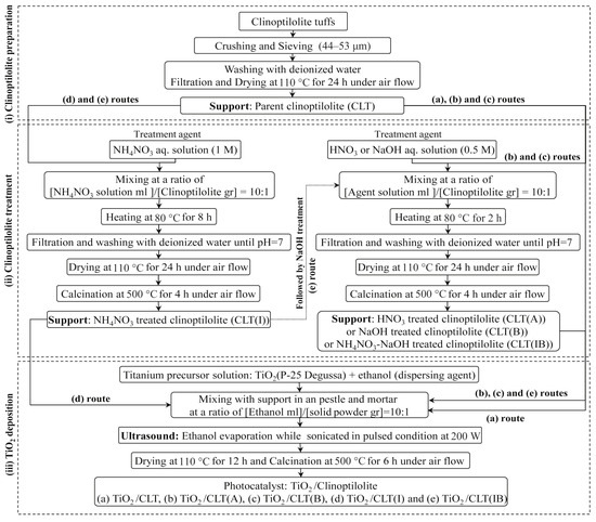 - Elghniji, K.; Elaloui, E.; Moussaoui, Y. Coating of anatase titania on clinoptilolite by metal organic chemical vapor deposition method: Enhanced mesoporosity and photocatalytic activity. Chem. Pap. 2018, 72, 1159–1168. [Google Scholar] [CrossRef]