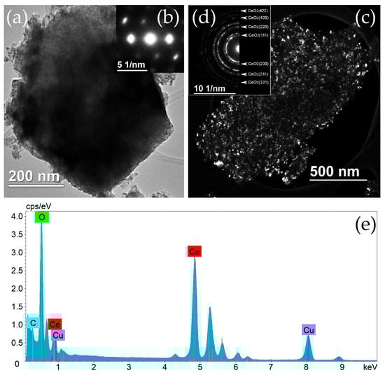 The initial CeO2 powder consisted of particles of an arbitrary shape and size. According to TEM data (Figure 1), some of these were rather large (1–2 μm) single crystals, but the major part was polycrystalline particles consisting of sticky small crystallites, 30–40 nm in diameter, as can be seen from the dark field (DF) TEM image and corresponding selected area electron diffraction (SAED) patterns. In the EDX spectrum, one can see peaks corresponding with cerium and oxygen. The carbon and copper peaks are presented due to the application of the powder onto the copper grids with an amorphous carbon substrate. Thus, no impurities were found in the initial powder under the study.
