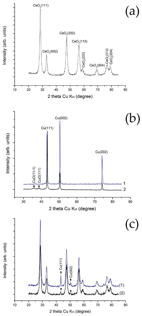 XRD patterns of the initial powders and the powder as-milled for 30 min, consisting of 8 mass% Cu–CeO2. (a) Ceria and (b) 1—Cu(D), 2—Cu(L) (2); (c) 1—Cu(D)–CeO2, 2—Cu(L)–CeO2.
