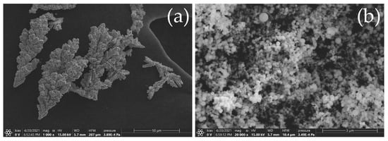 Figure 3 shows SEM images of initial copper metal powders. The Cu dendrite powder (Cu(D)) consisted of agglomerated flat metal particles (~0.6 μm long and 0.14 μm thick). According to XRD, the average crystalline size was 80 nm. The Cu(002)/Cu(111) ratio equal to 1.18 instead of the standard value of 0.46 indicates the texturing of particles in accordance with the dendrite morphology observed by SEM (Figure 3a). Cu metal powder prepared by the levitation-jet method consisted of round particles of 100–200 nm in size, most of which were agglomerated in chains, which is typical for the powder method used to obtain it (Figure 3b). According to XRD, the average crystalline size was ~25 nm. CuO traces (2ϴ = 35.58° and ~38.7° for CuO() and CuO(111), respectively) were also detected (Figure 2b).
