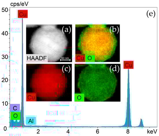 Chemical element distribution in a Cu(L) particle. (a) A HAADF STEM image, (b–d) element mapping, and (e) a corresponding EDX spectrum.