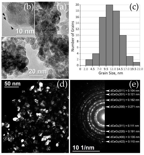 The structure of CeO2 powder particles after grinding in a ball mill. (a) A BF general view, (b) an HRTEM image of individual particles (black arrows indicate monoatomic steps), (c) a grain size distribution histogram, and (d,e) a DF image of conglomerate particles and corresponding SAED pattern.