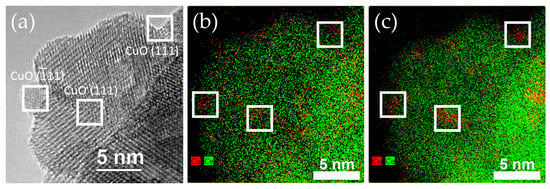 Cu(L)–CeO2 composite behavior under electron beam irradiation. (a) An HRTEM image; (b) EDX-mapping, 1 min irradiation; (c) EDX-mapping, 10 min irradiation.
